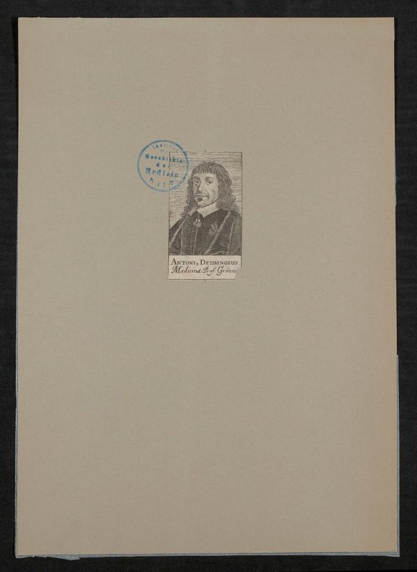 Unsignierter Kupferstich vermutlich aus: Paul Freher, Theatrum virorum eruditione clarorum, Nürnberg 1688. Vorderseitig mit einem Stempel des Institutes für Geschichte der Medizin, Wien, versehen.