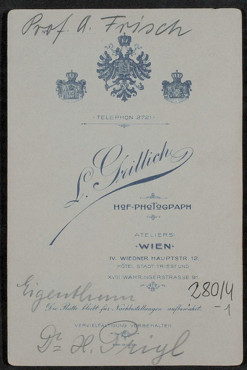 Die Fotografie wurde von Ludwig Grillich, Wien, angefertigt. Auf Rückseite befindet sich die Aufschrift: Eigentum Dr. H. Prigl. S/W Neg. (13x18)