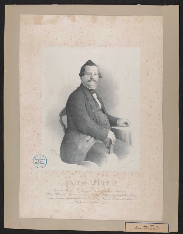 Die Lithografie ist von Franz Emphinger, Wien, angefertigt und von Andreas Leykam, Graz, gedruckt worden. Vorderseitig mit einem Stempel des Instituts für Geschichte der Medizin, Wien, versehen.