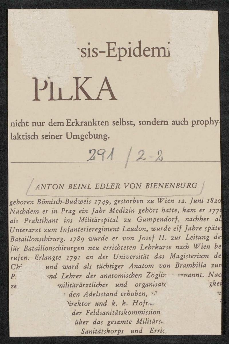 Die Vorlage des Bildes war ein Kupferstich von Anton Tepplar. Auf der Rückseite befinden sich biographische Angaben zu Anton Johann Beinl.