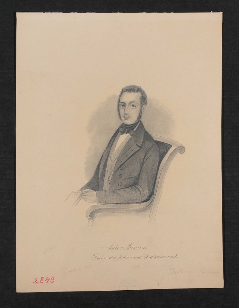 Vorlage war eine Lithografie unbekannter Urheber:innenschaft. Vorderseitig mit einem Stempel des Instituts für Geschichte der Medizin, Wien, versehen.