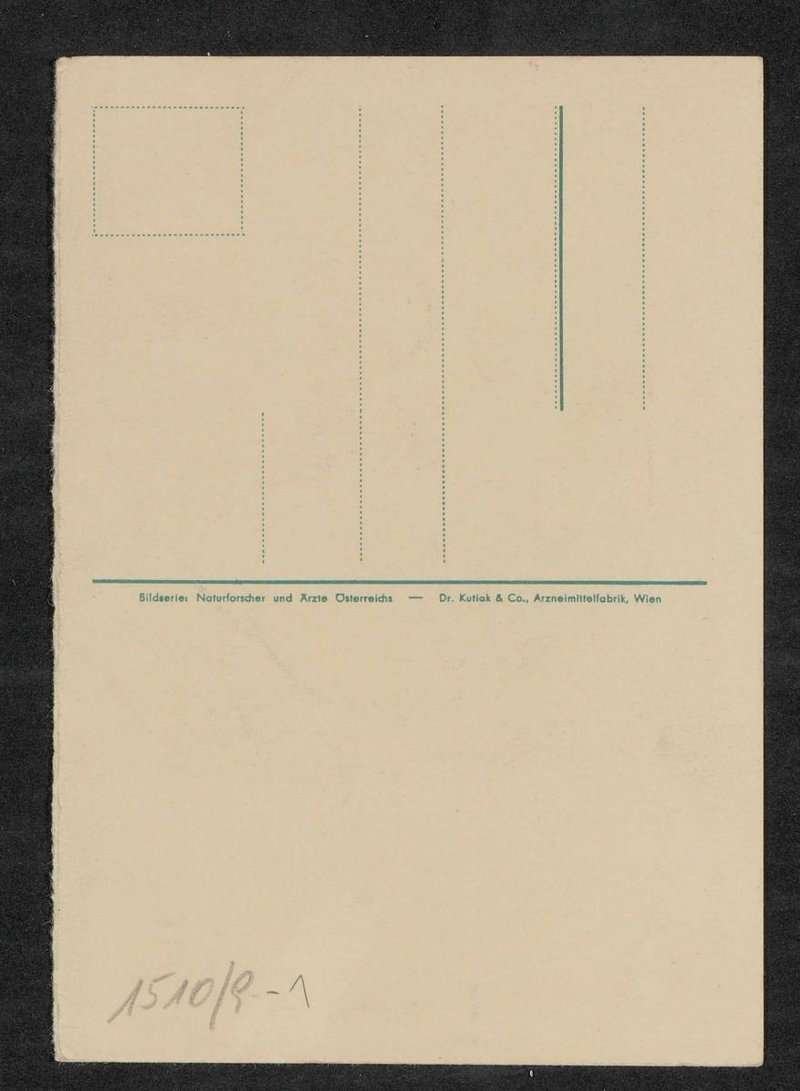 Die Postkarte wurde von der Dr. Kutiak und Co., Arzneimittelfabrik, Wien, in der Bilderserie Naturforscher und Ärzte Österreichs vertrieben.