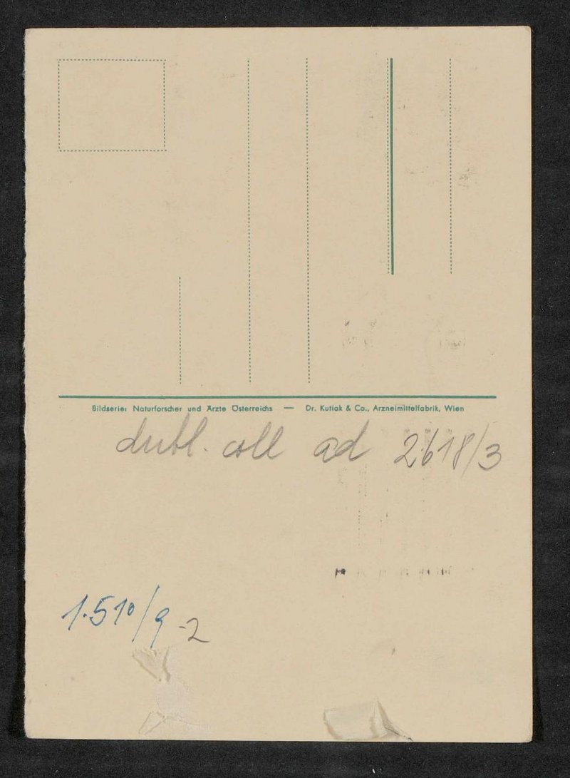 Die Postkarte wurde von der Dr. Kutiak und Co., Arzneimittelfabrik, Wien, in der Bilderserie Naturforscher und Ärzte Österreichs vertrieben.