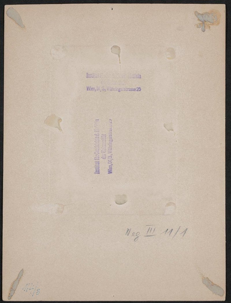 Die Vorder- und Rückseite sind mehrfach mit einem Stempel des Instituts für Geschichte der Medizin der Universität Wien, Wien, versehen. Neg III 11/1