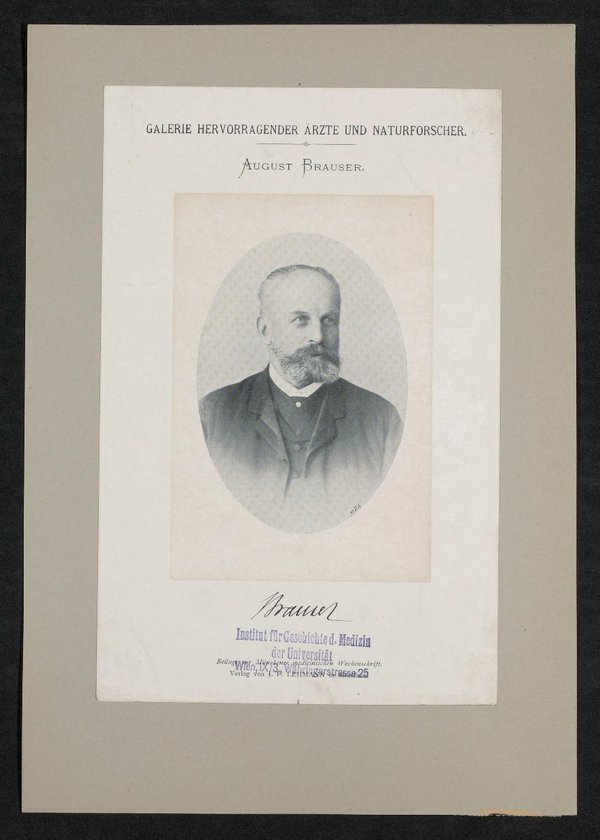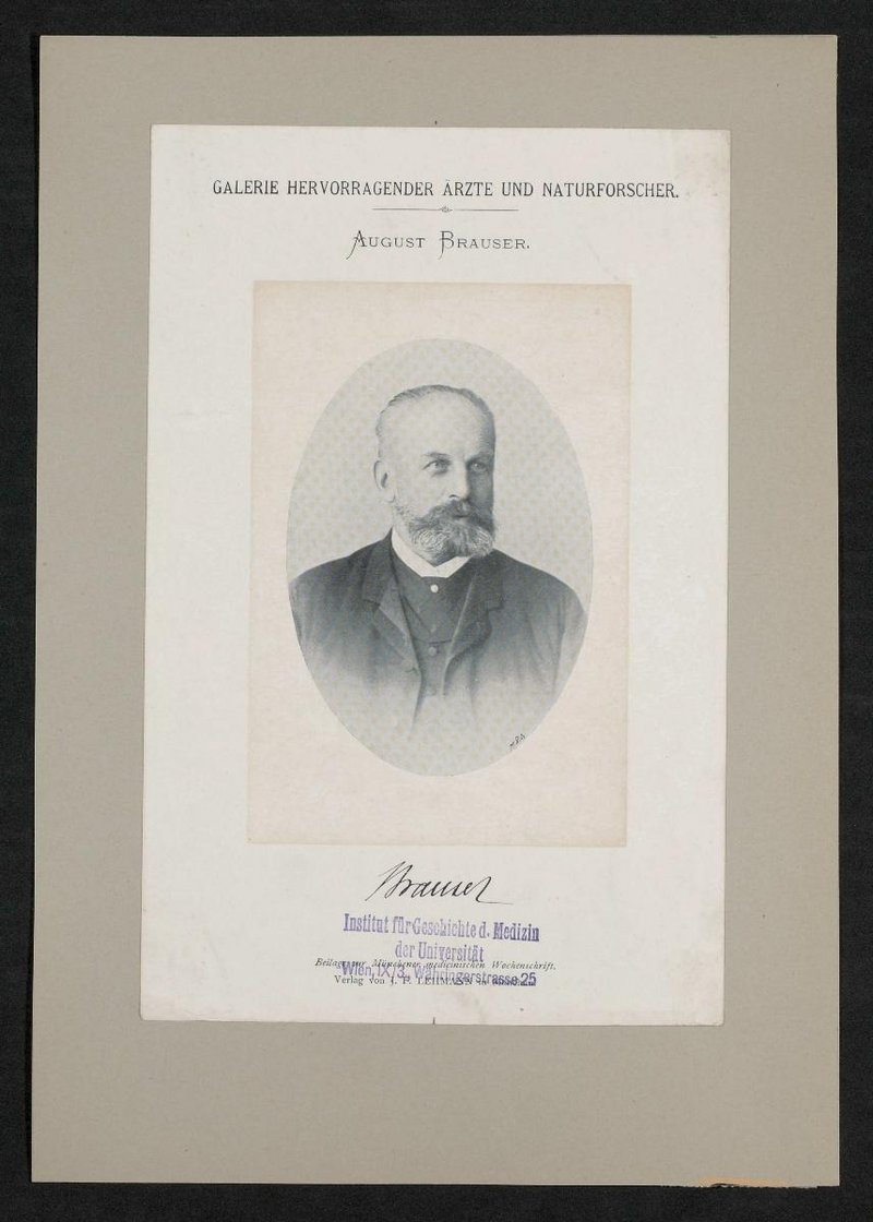Auszug aus: Galerie hervorragender Ärzte und Naturforscher, in: Beilage zur Münchener medizinischen Wochenschrift. Unter dem Bild befindet sich ein Stempel des Institutes für Geschichte der Medizin, Wien.