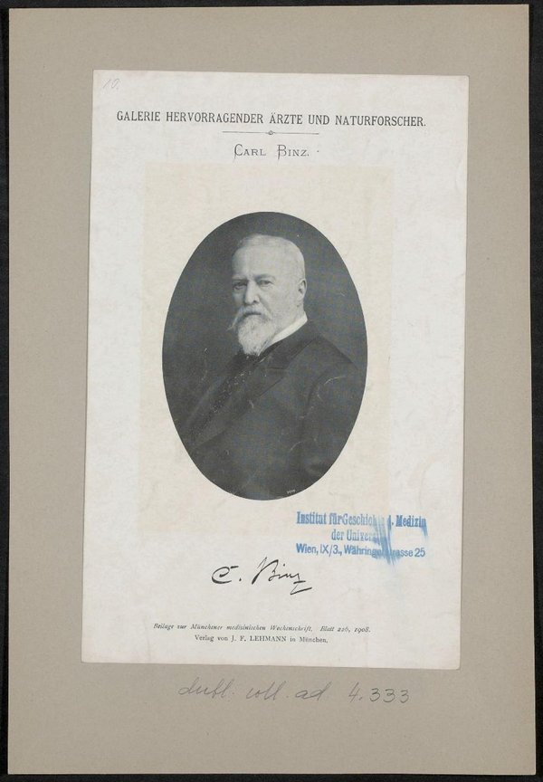 Auszug aus: Galerie hervorragender Ärzte und Naturforscher, in: Beilage zur Münchener medizinischen Wochenschrift, 1908, Bl. 226. Vorderseitig mit einem Stempel des Instituts für Geschichte der Medizin, Wien, versehen. Neg III 101/6