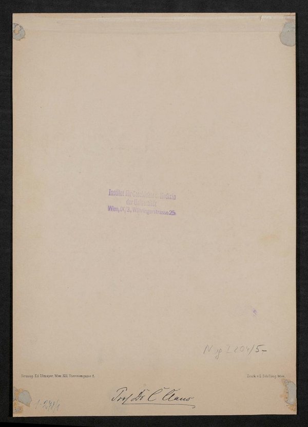 Die Lithografie wurde von Ludwig Schilling auf Grundlage einer Zeichnung von Rudolf Fenzl aus dem Jahr 1899 gedruckt und von Edmund Ulmayer herausgegeben. Vorder- und rückseitig mit einem Stempel des Instituts für Geschichte der Medizin, Wien, versehen. Neg I 204/5, 6