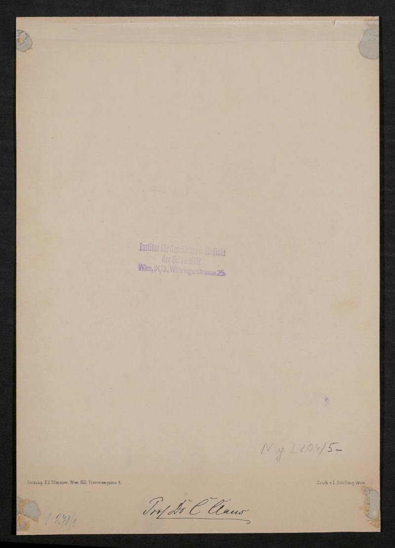 Die Lithografie wurde von Ludwig Schilling auf Grundlage einer Zeichnung von Rudolf Fenzl aus dem Jahr 1899 gedruckt und von Edmund Ulmayer herausgegeben. Vorder- und rückseitig mit einem Stempel des Instituts für Geschichte der Medizin, Wien, versehen. Neg I 204/5, 6