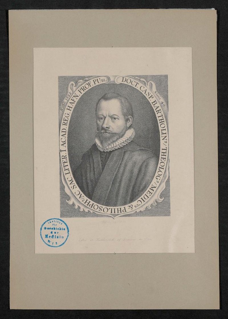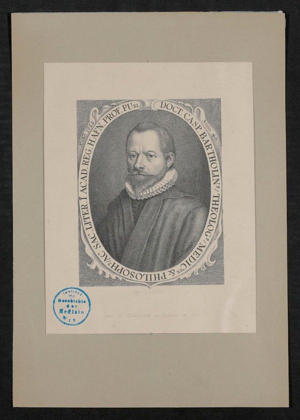 Die Lithografie wurde in der Druckwerkstatt Em. Bærentzen und Co., Kopenhagen, auf Grundlage eines Kupferstiches von Simon van de Passe aus dem Jahr 1625 angefertigt. Vorderseitig mit einem Stempel des Instituts für Geschichte der Medizin, Wien, versehen.