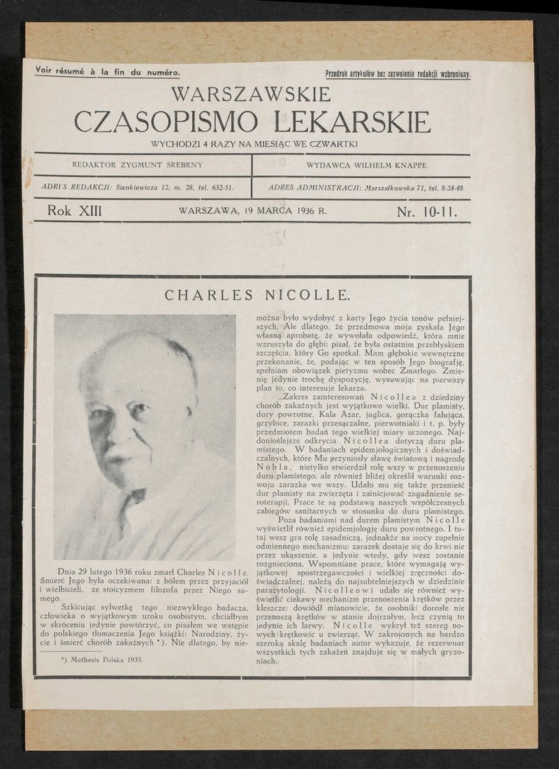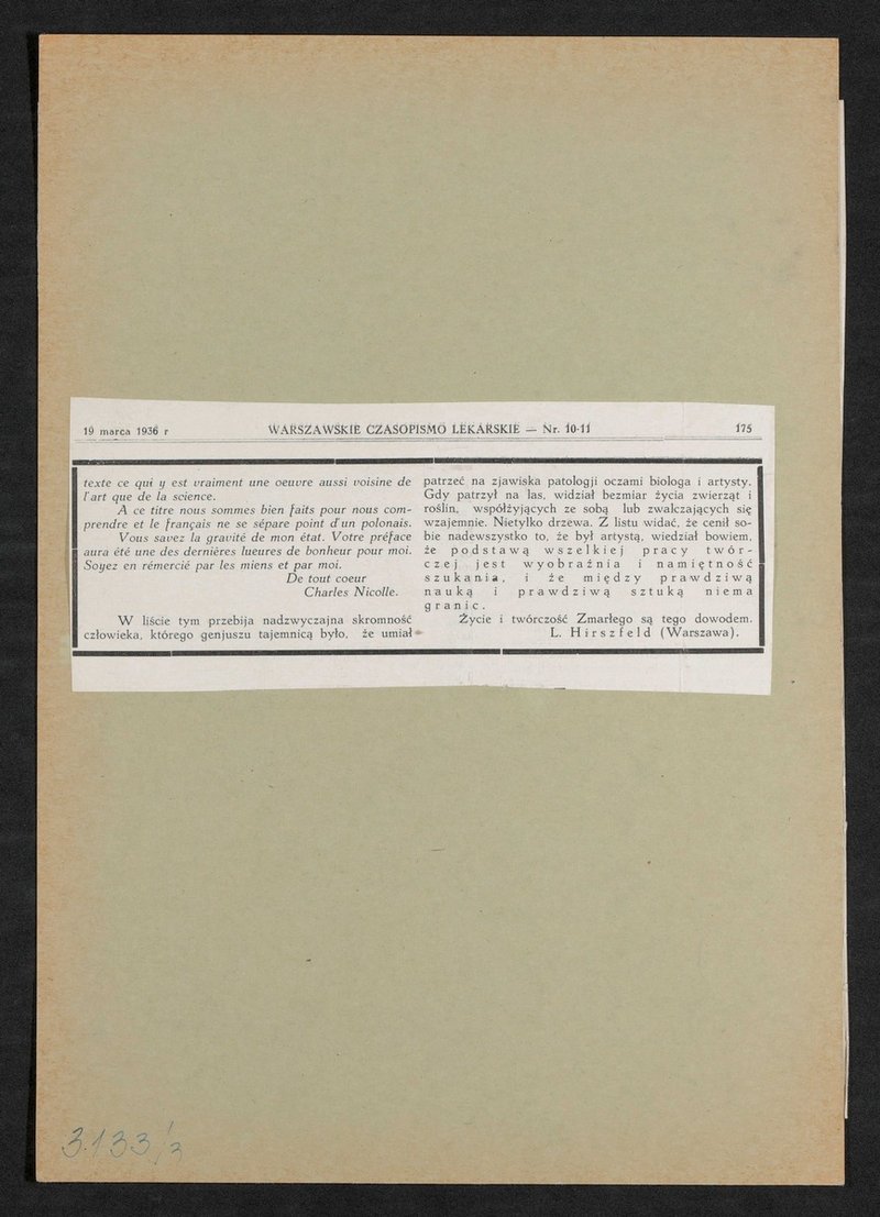 Auszug aus: Warszawskie Czasopismo Lekarskie, Nr. 10-11, 19.03.1936. Der Zeitungsausschnitt ist aus einem Nachruf entnommen, welcher sich auf der Vorderseite und der Rückseite befindet.