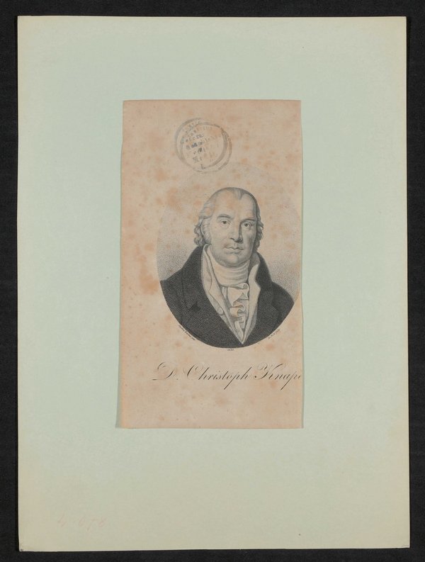 Der Kupferstich ist von Johann Friedrich Bolt auf Grundlage einer Zeichnung von Caroline Bardua angefertigt worden. Vorderseitig mit einem Stempel des Instituts für Geschichte der Medizin, Wien, versehen.