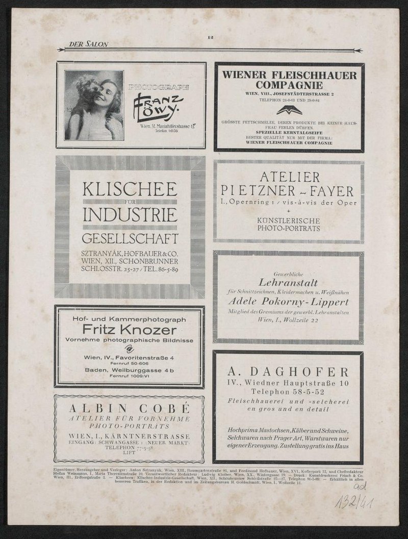 Fotografie von: Atelier Schieberth, Wien. Überliefert sind drei Exemplare der Zeitschrift Der Salon in einer Mappe des Atelier Kosel, wobei die Fotografie auf der Titelseite von einem anderen Atelier stammt. Der Mappe wurde die Inventarnummer 132/41 gegeben und alle drei Exemplare wurden mit ad 132/41 beschriftet.