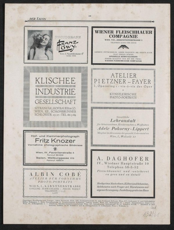 Fotografie von: Atelier Schieberth, Wien. Überliefert sind drei Exemplare der Zeitschrift Der Salon in einer Mappe des Atelier Kosel, wobei die Fotografie auf der Titelseite von einem anderen Atelier stammt. Der Mappe wurde die Inventarnummer 132/41 gegeben und alle drei Exemplare wurden mit ad 132/41 beschriftet.