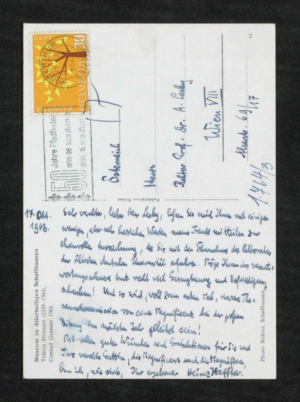 Die fotografische Vorlage der Postkarte wurde von Bührer, Schaffhausen, angefertigt. Dem Bild lag ein Gemälde von Tobias Stimmer als Vorlage zugrunde, das zum Zeitpunkt der Anfertigung der Karte zur Sammlung des Museums zu Allerheiligen, Schaffhausen, gehörte.