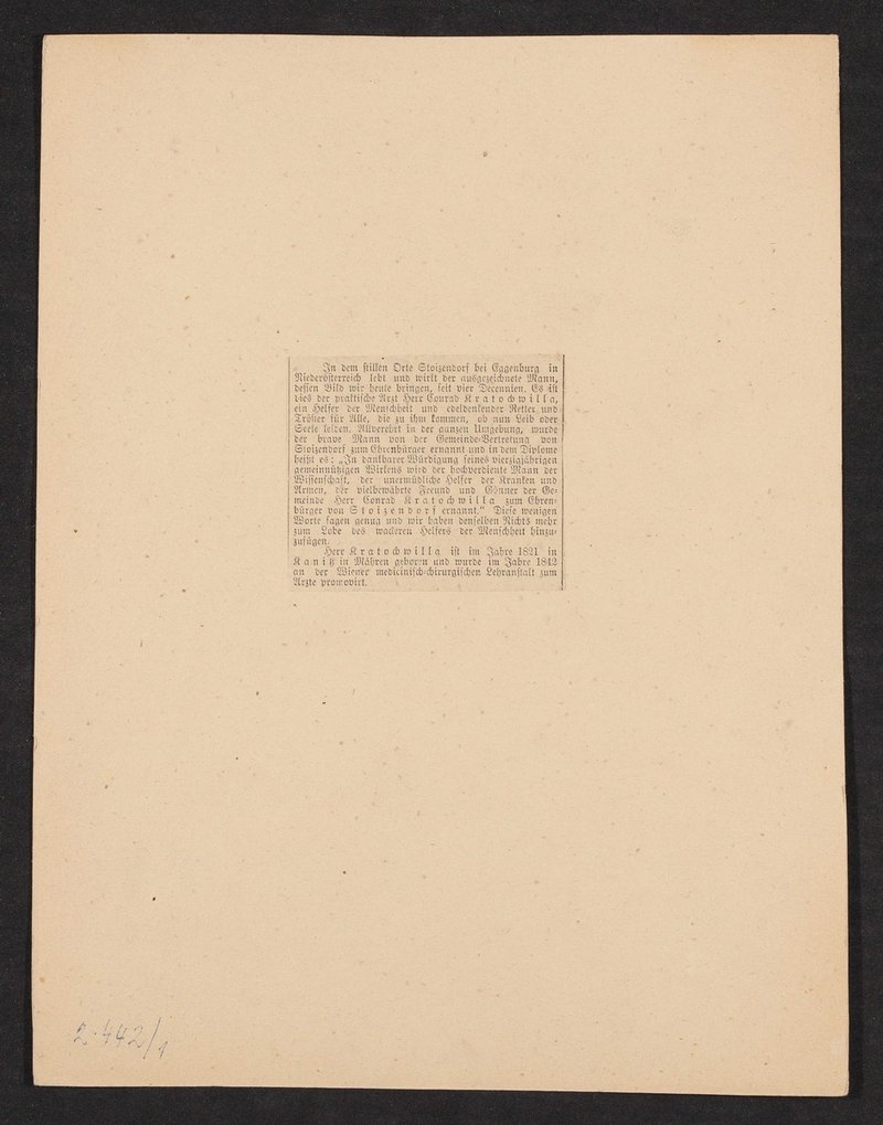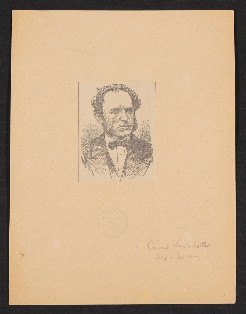 Auf der Rückseite befindet sich ein Zeitungsausschnitt zu seinem Leben und seinem fachlichen Wirken. Vorderseitig mit einem Stempel des Institutes für Geschichte der Medizin, Wien, versehen.