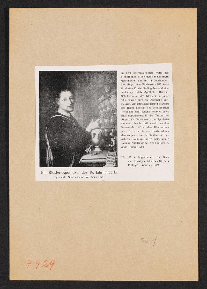 Auszug aus: Illustrierter Apotheker-Kalender, 1928, gedruckt im Verlag des Deutschen Apotheker-Vereins. Vorlage war ein unsigniertes Ölgemälde vermutlich von 1764, das sich zum Zeitpunkt der Herstellung des Drucks im Stadtmuseum Weilheim, Weilheim, befand.