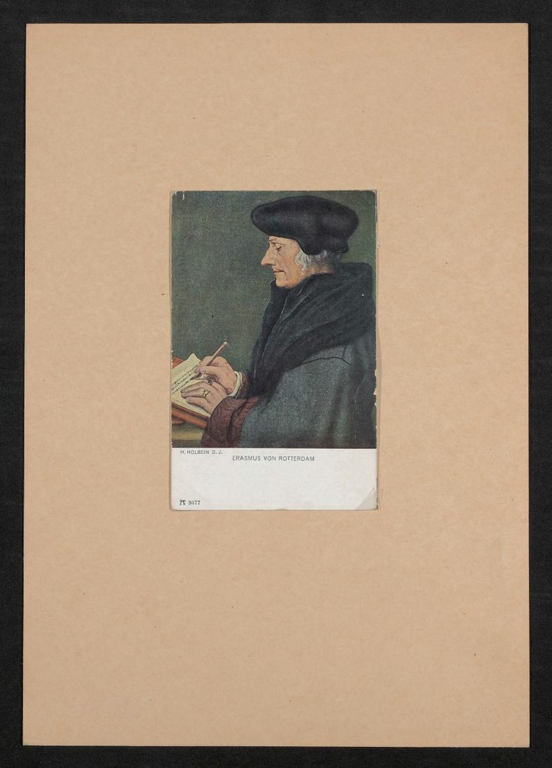 Als Absender ist Leopold von Dittel zu identifizieren. Die Postkarte wurde von Friedrich Adolf Ackermanns Kunstverlag, München, vertrieben. Dem Bild lag ein Gemälde von Hans Holbein dem Jüngeren als Vorlage zugrunde.