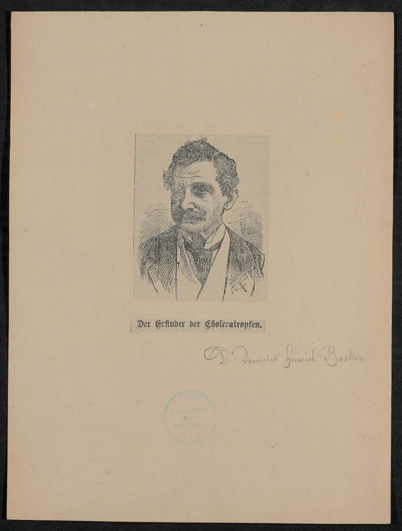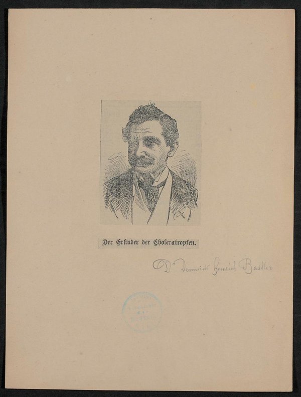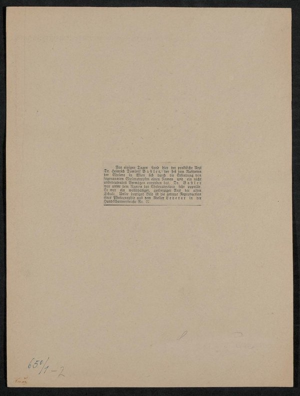 Ausschnitt aus einem Nachruf. Der dazugehörige Text ist auf der Rückseite angebracht. Die Vorlage des Bildes war eine Zeichnung. Vorder- und rückseitig befinden sich Stempel des des Institutes für Geschichte der Medizin, Wien.