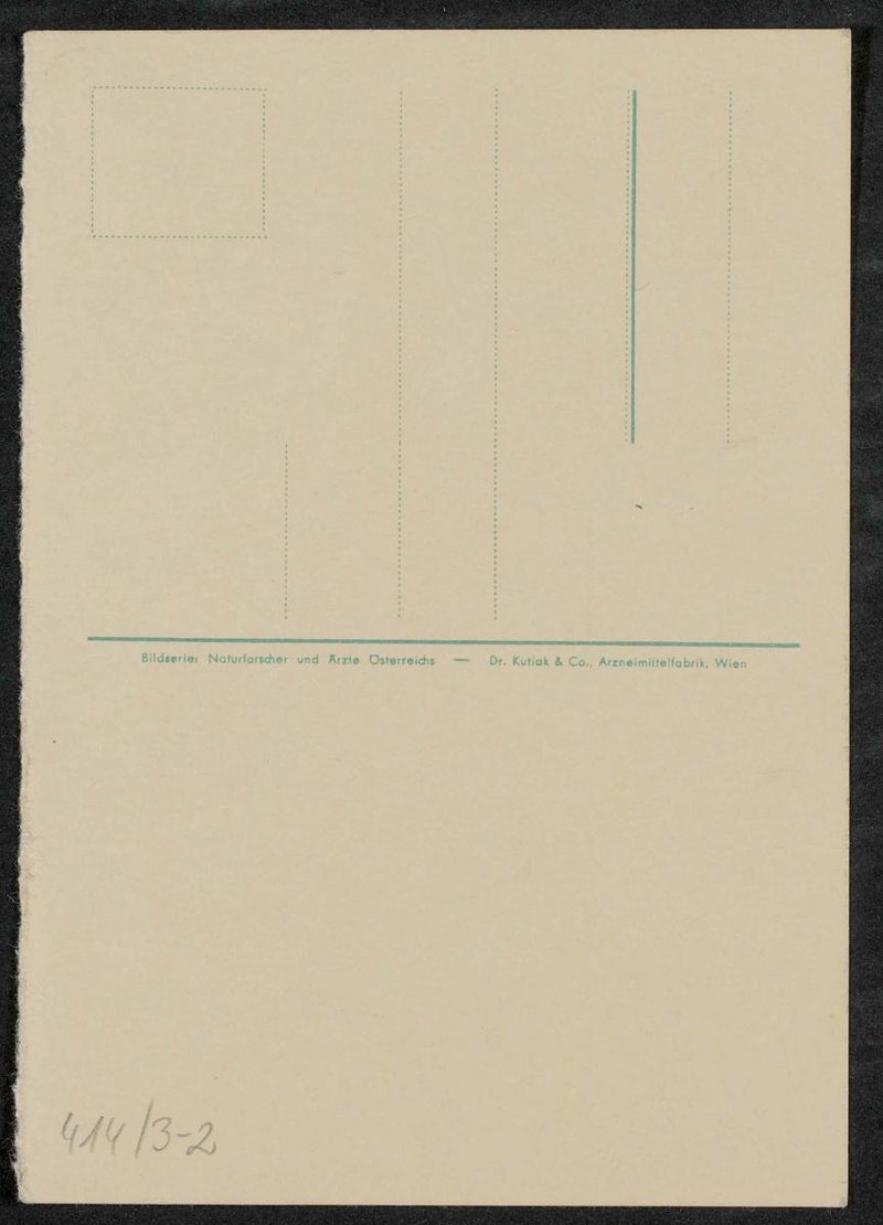 Die Postkarte wurde von der Dr. Kutiak und Co., Arzneimittelfabrik, Wien, in der Bilderserie Naturforscher und Ärzte Österreichs vertrieben.