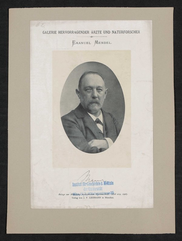 Auszug aus: Galerie hervorragender Ärzte und Naturforscher, in: Beilage zur Münchener medizinischen Wochenschrift, 1907, Bl. 214. Das Bild wurde von Julius Friedrich Lehmann verlegt. Vorderseitig mit einem Stempel des Institutes für Geschichte der Medizin, Wien, versehen.