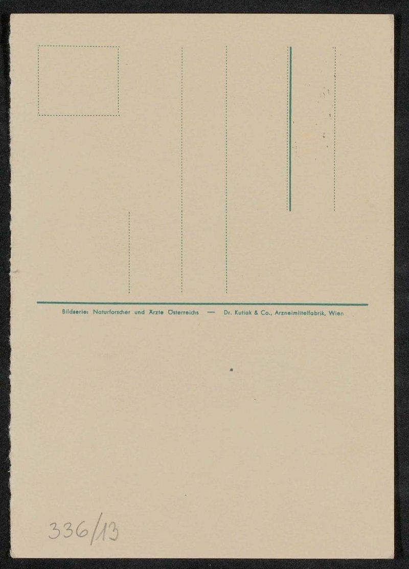 Die Postkarte wurde von Dr. Kutiak und Co., Arzneimittelfabrik, Wien, in der Bilderserie Naturforscher und Ärzte Österreichs vertrieben.