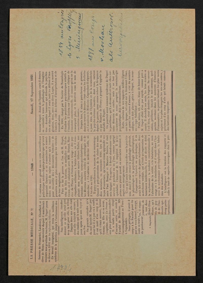 Ausschnitt aus: La Presse Medicale, Nr. 75, vom 17.09.1921, S. 1347-1348. Die fotografische Vorlage wurde von Henri Manuel, Paris, angefertigt.