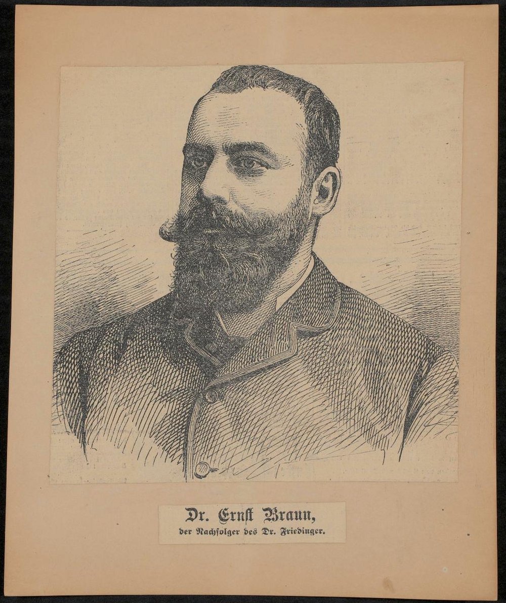 Ausschnitt aus einem Nachruf für Ernst Braun. Der dazugehörige Text ist auf der Rückseite angebracht. Die Vorlage des Bildes war eine Zeichnung.