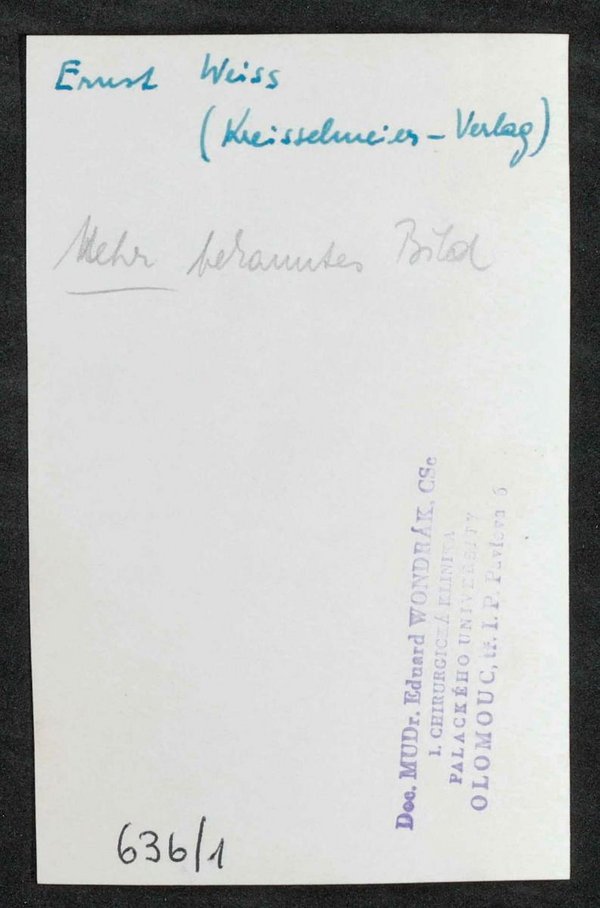 Mit rückseitigem Stempel von Eduard Wondrak, Olmütz, sowie einer Notiz, die darauf schließen lässt, dass das Bild für die Drucklegung des Romans Ich, der Augenzeuge, Icking: Verlag Kreißelmeier, 1963, verwendet worden ist.