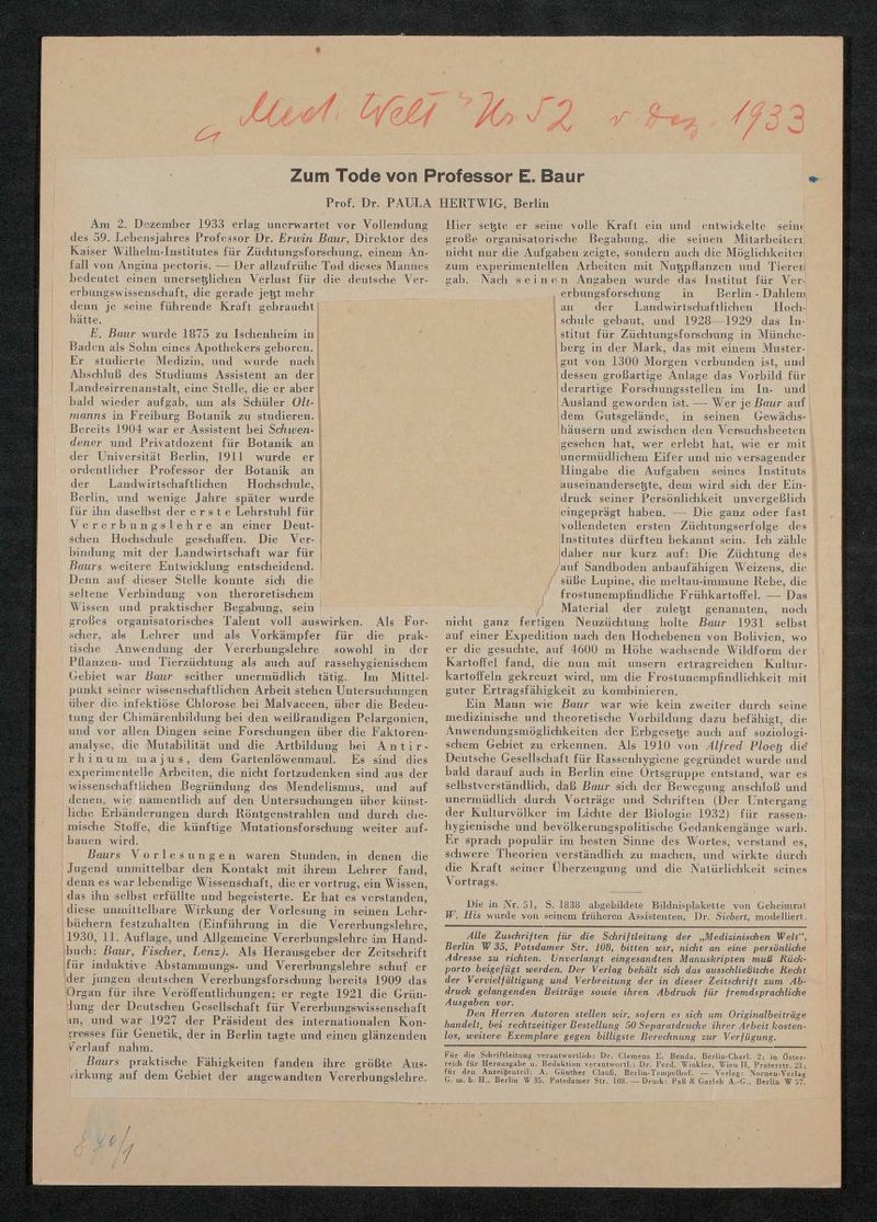Der von Paula Hertwig, Berlin, verfasste Nachruf befindet sich auf der Rückseite, entnommen aus: Die Medizinische Welt, Nr. 52, Dezember 1933.