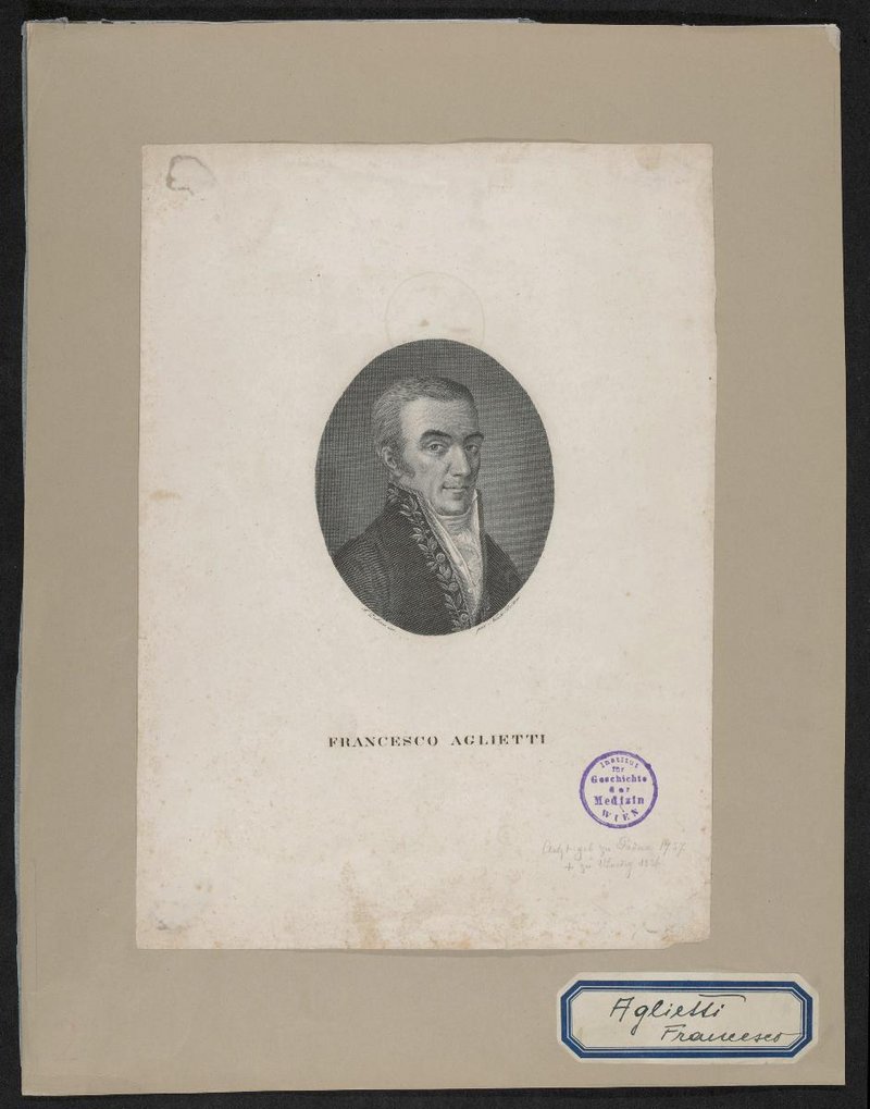 Der Kupferstich wurde von Felice Zuliani, Venedig, angefertigt und von Niccolò Bettoni gedruckt. Vorderseitig mit einem Stempel des Institutes für Geschichte der Medizin, Wien, versehen.