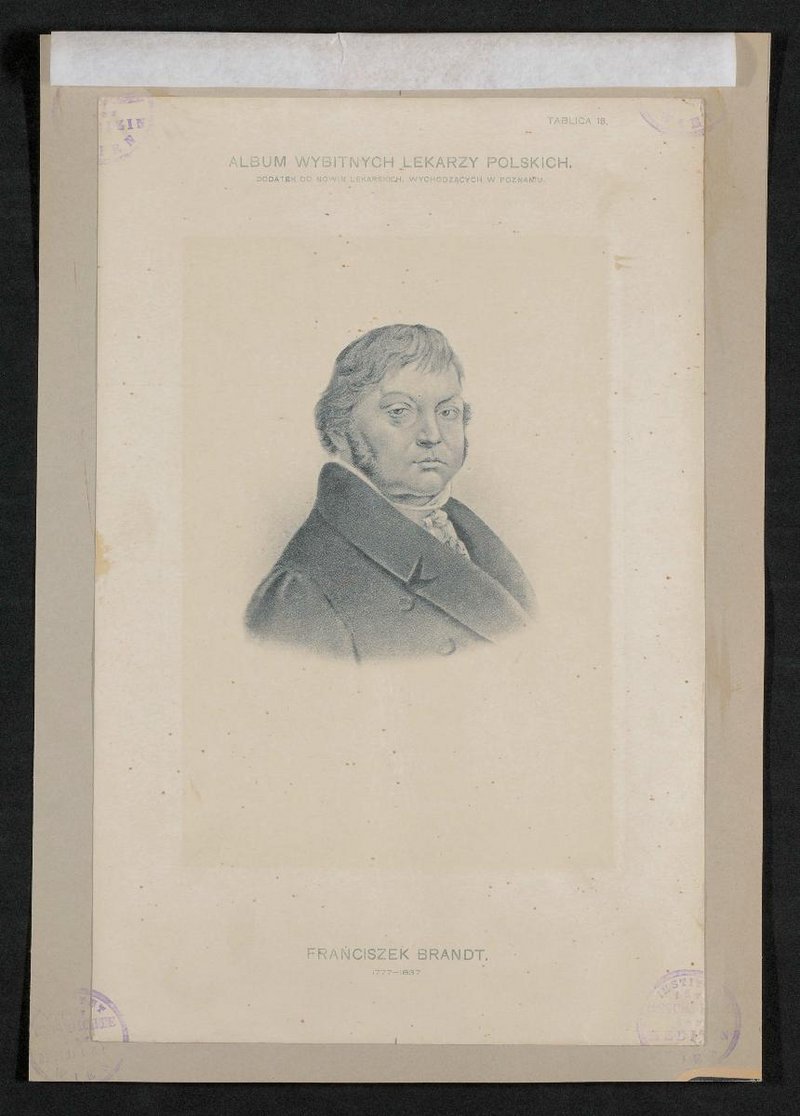 Auszug aus: Album Wybitnych Lekarzy Polskich, Übersetzung: Album herausragender polnischer Ärzte. Beilagen zu den in Posen veröffentlichten medizinischen Nachrichten, Tafel 18. Auf der Grafik befinden sich mehrere Stempel des Institutes für Geschichte der Medizin, Wien.