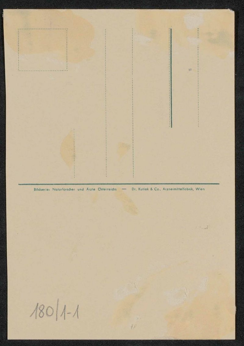 Das Motiv wurde um 1910 aufgenommen. Die Postkarte wurde von der Dr. Kutiak und Co., Arzneimittelfabrik, Wien, in der Bilderserie Naturforscher und Ärzte Österreichs vertrieben. Die Vorlage stammte von Max Schneider, Wien. Neg. III 114/1