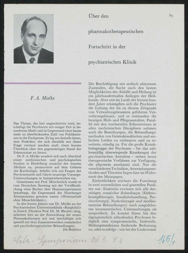 Der Beitrag ist dem Ciba-Symposium, Bd. 5, Heft 3, 1957, S. 89-90, entnommen. In dem Artikel berichtet Mielke über den pharmakotherapeutischen Fortschritt in der psychiatrischen Klinik.