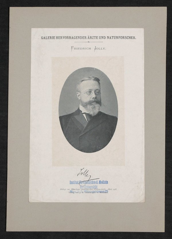 Auszug aus: Galerie hervorragender Ärzte und Naturforscher, in: Beilage zur Münchener medizinischen Wochenschrift, 1904, Bl. 148. Das Bild wurde von Julius Friedrich Lehmann verlegt. Vorderseitig mit einem Stempel des Institutes für Geschichte der Medizin, Wien, versehen.