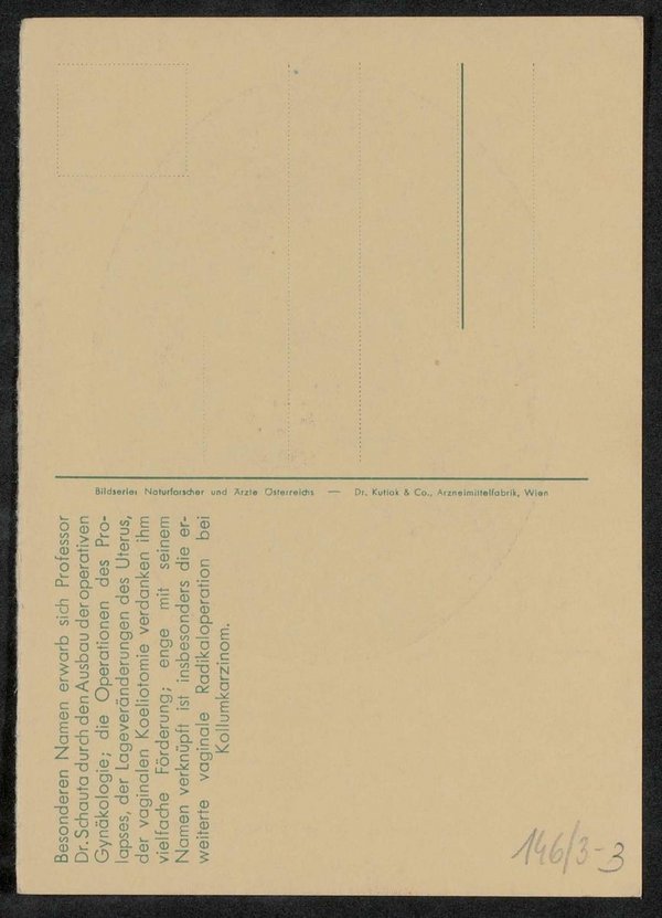 Die Ansichtskarte wurde von der Dr. Kutiak und Co., Arzneimittelfabrik, Wien, in der Bilderserie Naturforscher und Ärzte Österreichs vertrieben.