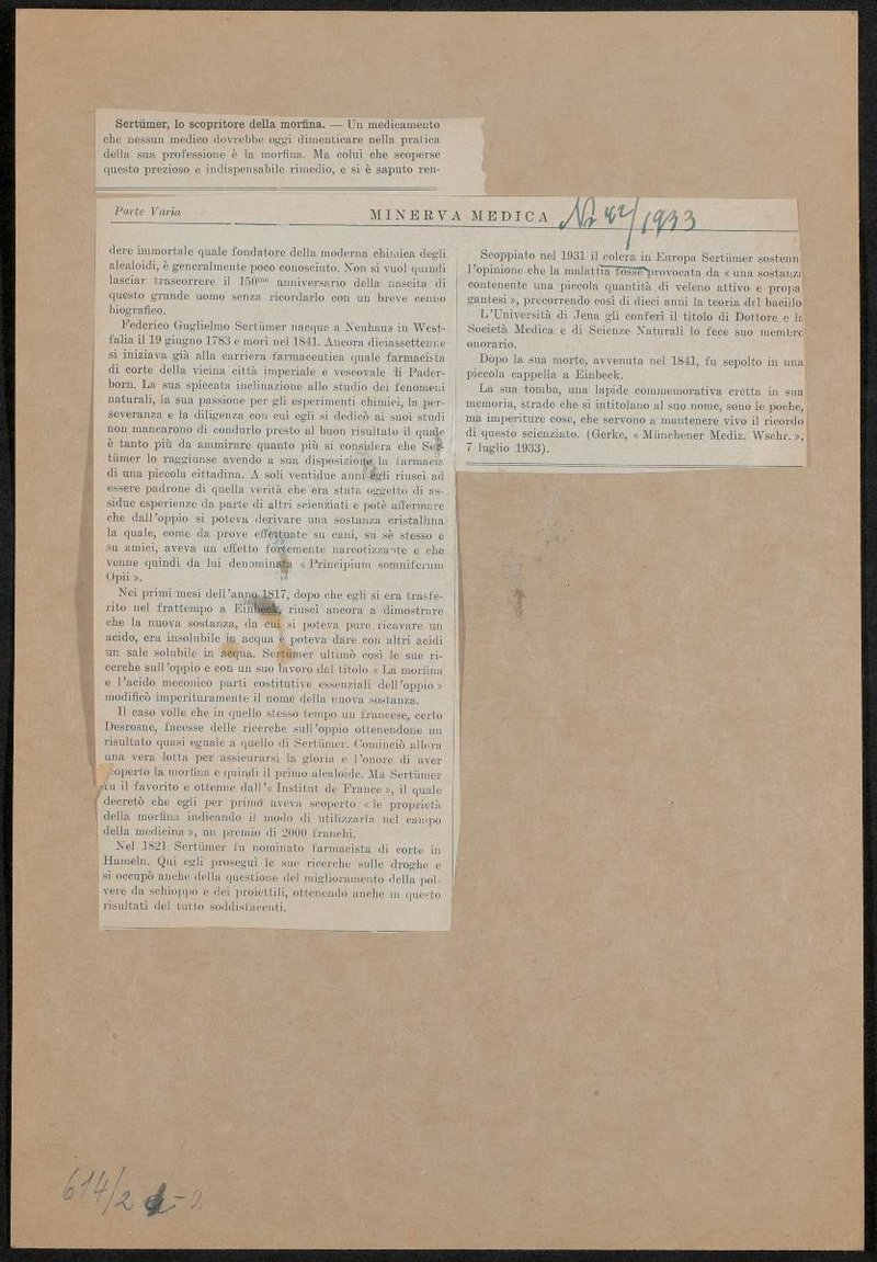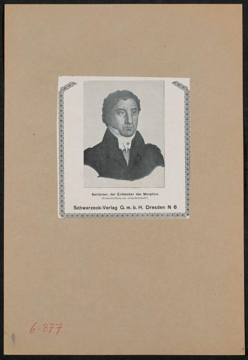 Vermutlich wurde die Ablichtung in Ernst Friedrich Gilg und Paul Norbert Schürhoff, Aus dem Reiche der Drogen. Geschichtliche, kulturgeschichtliche und botanische Betrachtungen über wichtigere Drogen, Dresden: Schwarzeck Verlag, 1926, als Vorlage genutzt. Rückseitig mit einem italienischsprachigen Artikel über Sertürner, aus: Minerva Medica, Nr. 42, 1933.