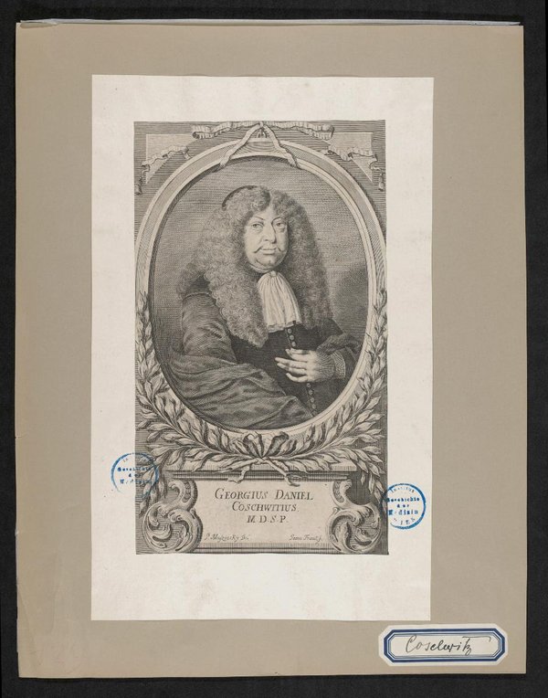 Der Kupferstich wurde von Johann Franck nach einer Zeichnung von P. Muszinsky angefertigt. Vorderseitig mit zwei Stempeln des Institutes für Geschichte der Medizin, Wien, versehen.