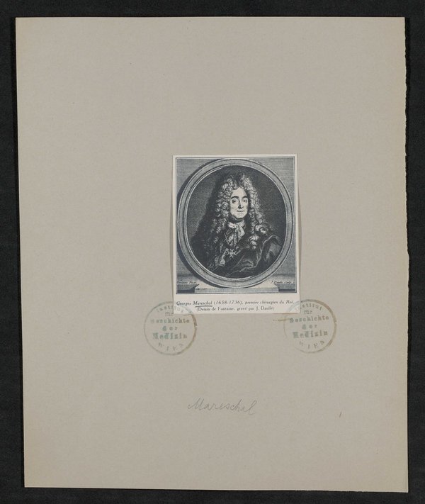 Der Kupferstich wurde von Jean Daulle auf der Grundlage eins Bildes von Fontaine angefertigt. Auf der Vorderseite befinden sich zwei Stempel des Instituts für Geschichte der Medizin, Wien.