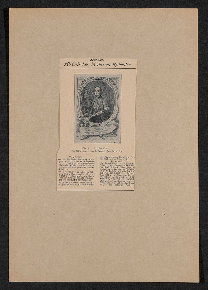 Das Bild ist Spemanns Historischem Medicinal-Kalender entnommen worden. Die Vorlage ist 1728 von Giovanni Maria Salvioni angefertigt worden. Sie befand sich zum Zeitpunkt der Anfertigung des Bildes im Besitz von Ernst Roediger, Frankfurt am Main.