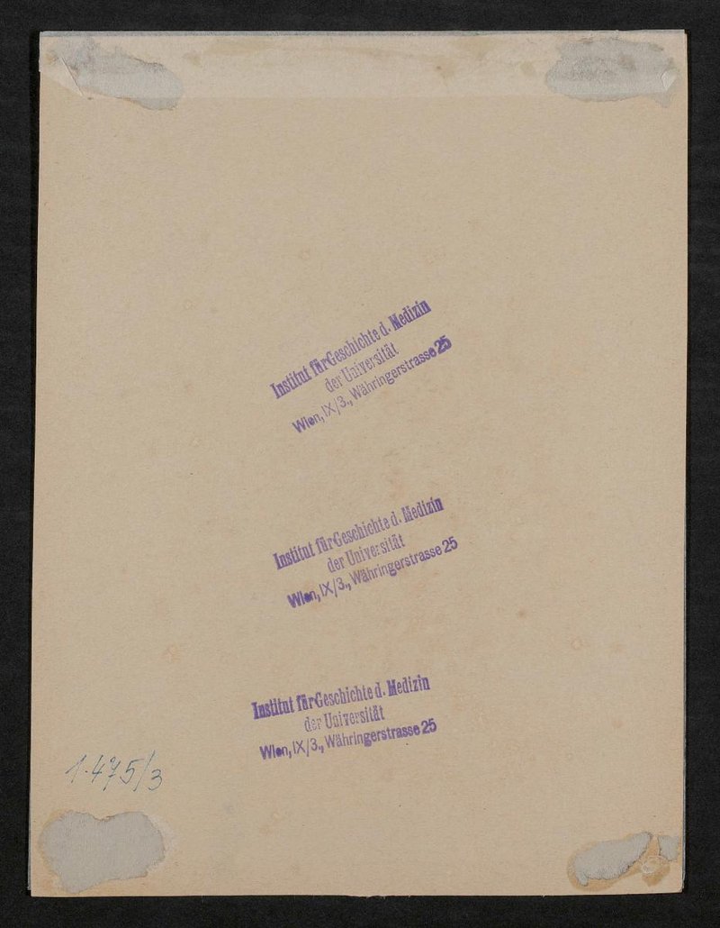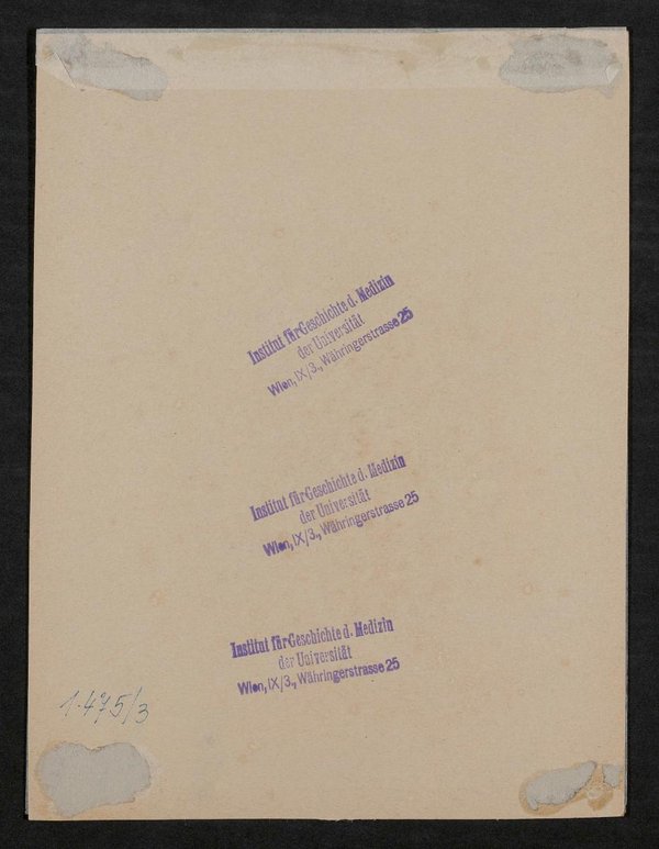 Die Lithografie wurde von August Kneisel, Leipzig, nach einer Zeichnung von Cäcilie Brandt angefertigt. Vorder- und rückseitig mit Stempeln des Institutes für Geschichte der Medizin, Wien, versehen.