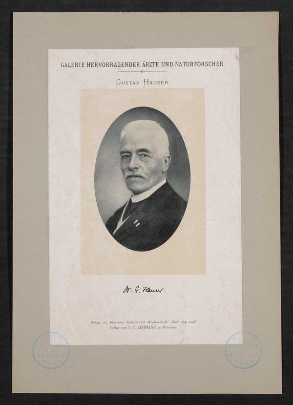 Auszug aus: Galerie hervorragender Ärzte und Naturforscher, in: Beilage zur Münchener medizinischen Wochenschrift, 1926, Bl. 374. Das Bild wurde von Julius Friedrich Lehmann verlegt. Vorderseitig mit zwei Stempeln des Institutes für Geschichte der Medizin, Wien, versehen.