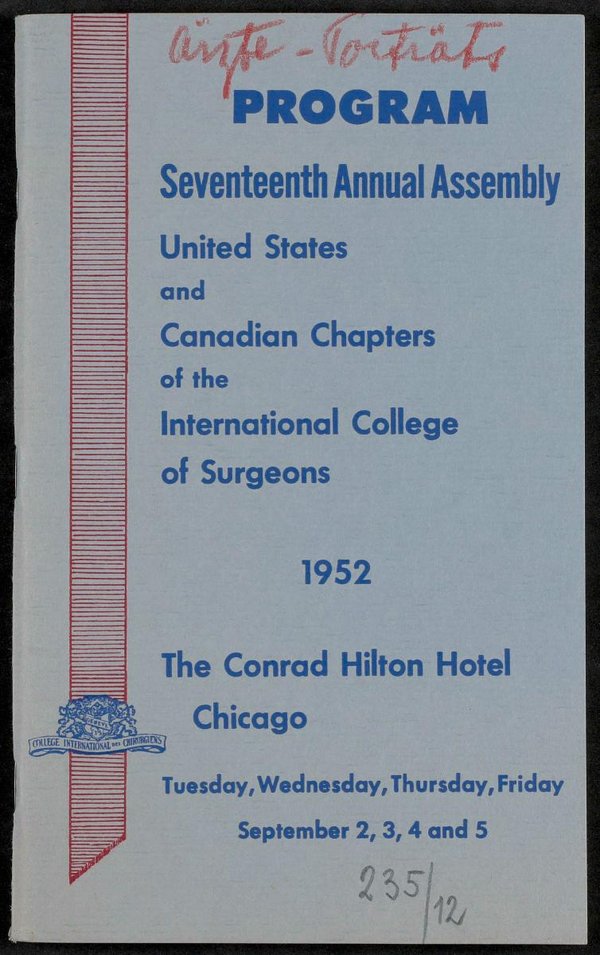 Abbildung aus: Program. Seventeenth Annual Assembly, United States and Canadian Chapters of the International College of Surgeons 1952, S. 5. Das Programmheft enthält weitere Porträts von Ärzt:innen.