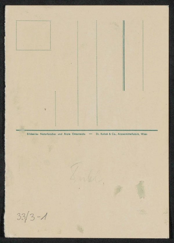 Die Vorlage wurde von Max Schneider angefertigt. Die Ansichtskarte wurde von der Dr. Kutiak und Co., Arzneimittelfabrik, Wien, in der Bilderserie Naturforscher und Ärzte Österreichs vertrieben.