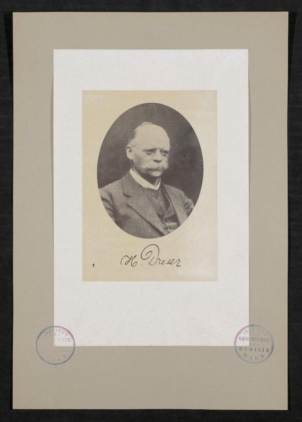 Ausschnitt vermutlich aus: Galerie hervorragender Ärzte und Naturforscher, in: Beilage zur Münchener medizinischen Wochenschrift, 1909, Bl. 249. Vorderseitig mit zwei Stempeln des Institutes für Geschichte der Medizin, Wien, versehen.