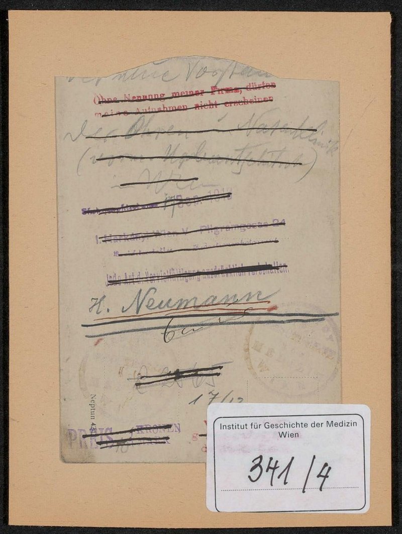 Der Hintergrund der Fotografie wurde blau angemalt. Rückseitig befinden sich Stempel des Institutes für Geschichte der Medizin, Wien.