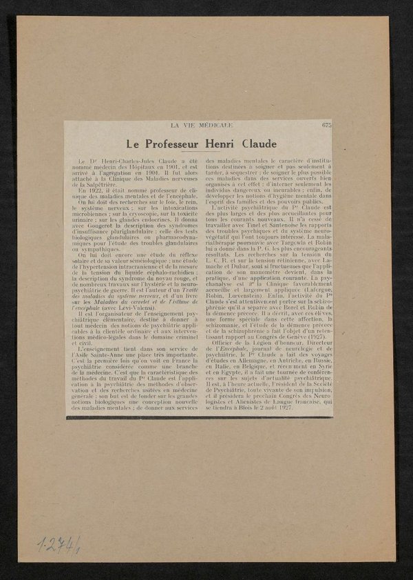 Mit einem Bericht über seine fachlichen Fertigkeiten. Bild und Bericht sind einer unbekannten Ausgabe der französischsprachigen Fachzeitschrift La Vie Medicale entnommen worden.