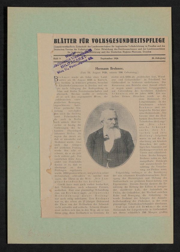 Die beiden Ausschnitte stammen aus: Blätter für Volksgesundheitspflege, Heft 9, 26. Jg., 1926, S. 153-158; sowie aus Die Therapie der Gegenwart, August 1926, Berlin und Wien, S. 383-384. Vorderseitig befindet sich ein Stempel mit der Inschrift: Wiener Medizinischen Wochenschrift. Militärarzt, Wien. Neg I 216/26, 27