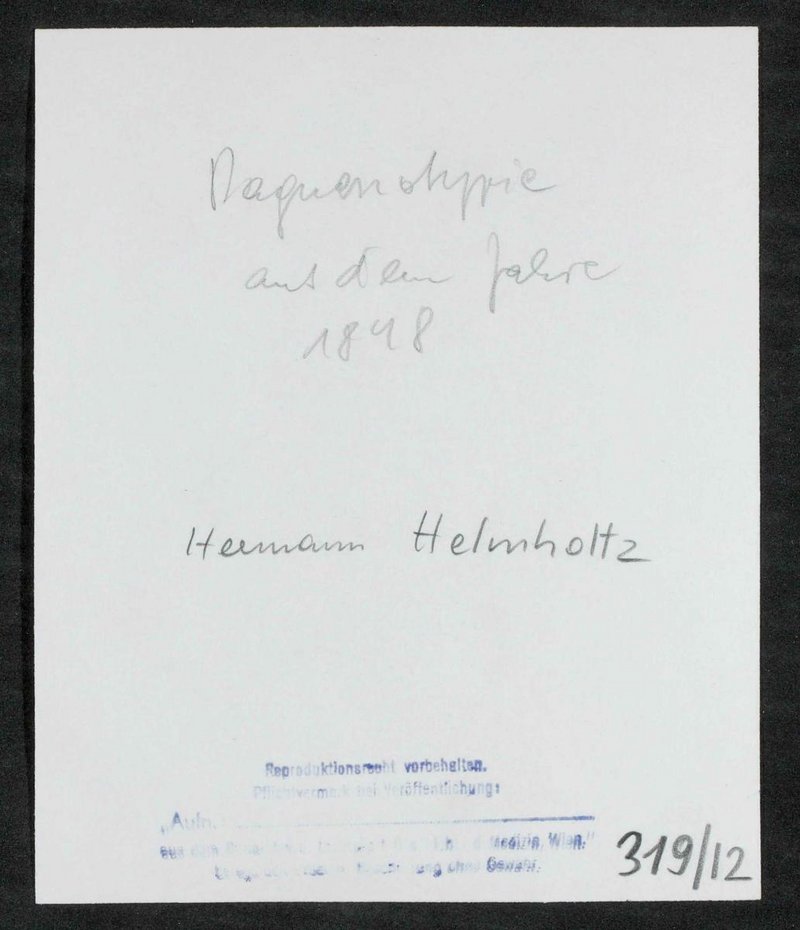 Reproduktion einer Fotografie (Daguerreotypie) aus dem Jahr 1848, abgebildet in: Hundert Jahr Augenspiegel, Leipzig 1951. S. 7. Neg. I 205/25, 26