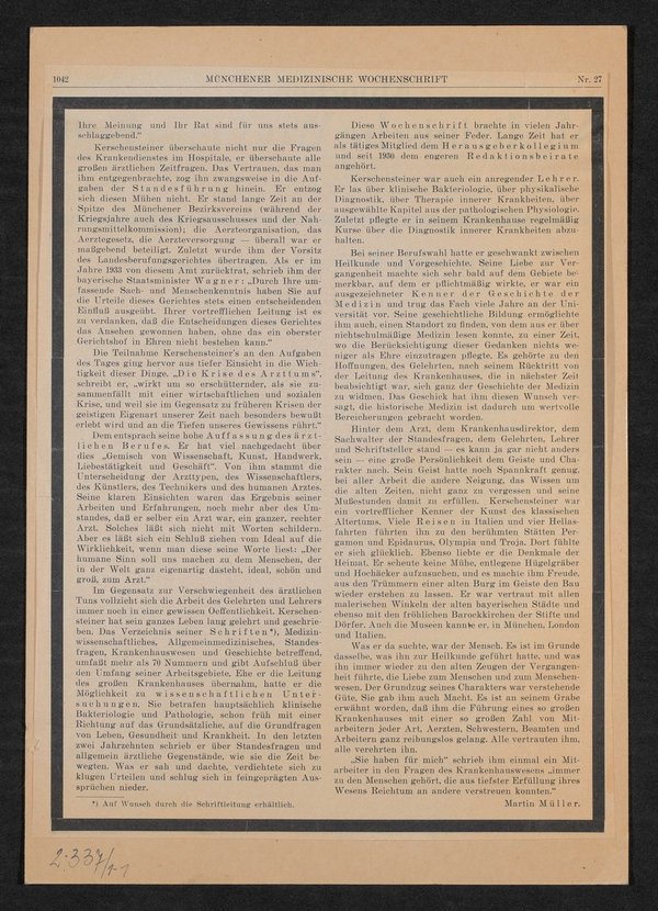 Auszug aus: Galerie hervorragender Ärzte und Naturforscher, in: Beilage zur Münchener medizinischen Wochenschrift, 1937, Bl. 533. Mit einem Nachruft von Martin Müller aus der Münchener Medizinischen Wochenschrift, Nr. 27, 2. Juli 1927, S. 1041 f., auf der Rückseite.