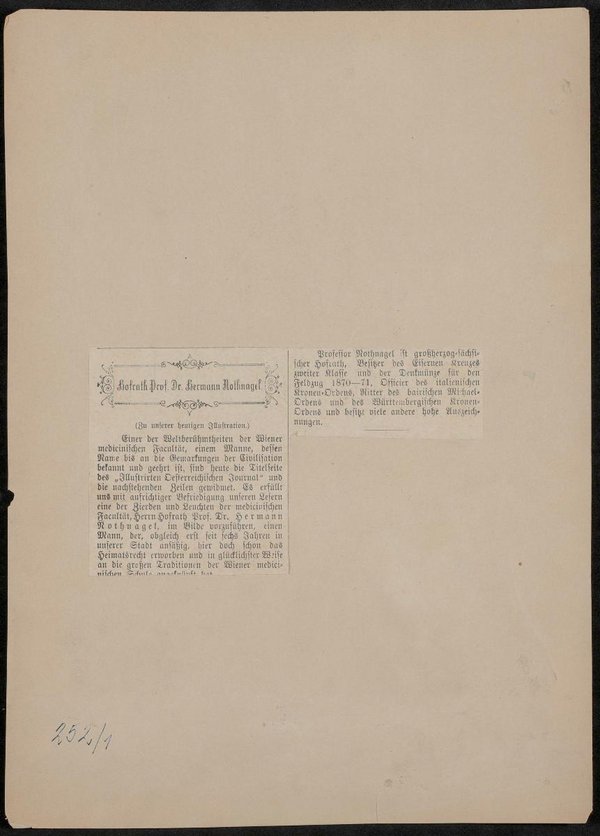 Mit einem Stempel des Instituts für Geschichte der Medizin, Wien, und rückseitig mit Angaben über die berufliche Laufbahn Nothnagels versehen.